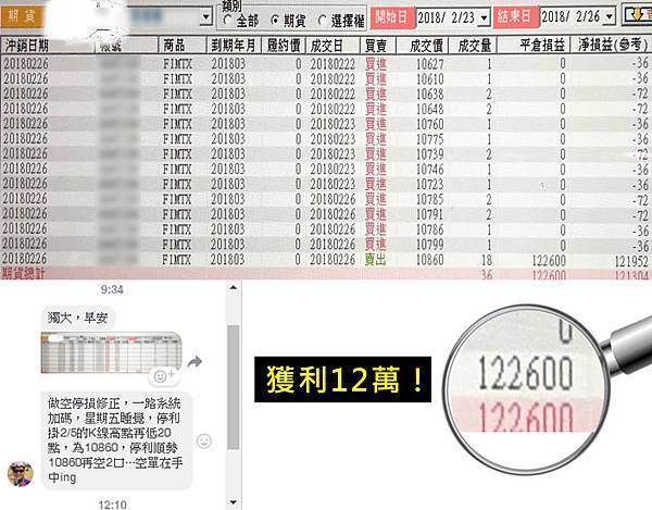 沒想到這波這麼快就結束~今天上午都在開會,完全無法盯盤,本想要抱波段,停利設高低點拉回100點,所以今天停利出場,也很不錯了,有將近12萬,第一次賺這麼多。